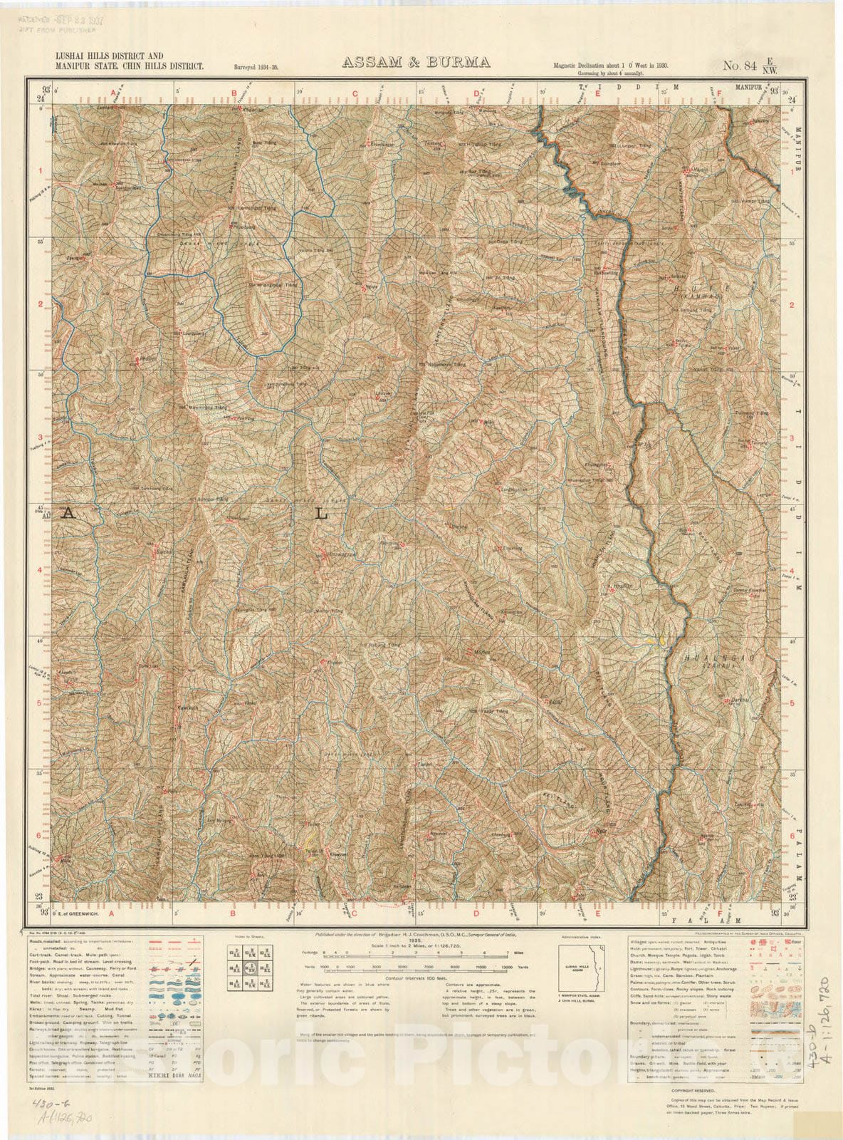• .Map : Lushai Hills District and Manipur State, Chin Hills District, Assam & Burma, No. 84 E/N.W. 1936, India and adjacent countries, Antique Vintage Reproduction