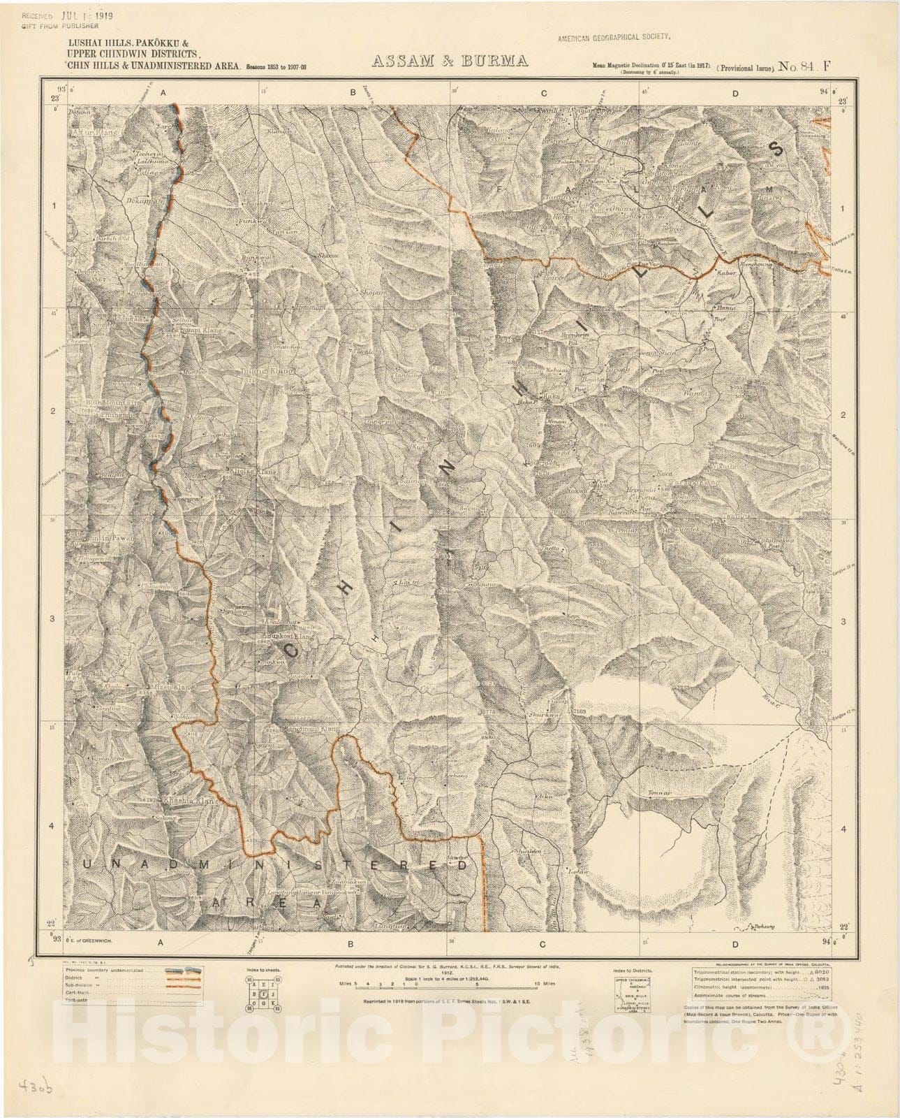 • .Map : Lushai Hills, Pakokku & Upper Chindwin Districts, Chin Hills & Unadministered area, Assam & Burma, No. 84 F 1912, India 1:253,440, Antique Vintage Reproduction