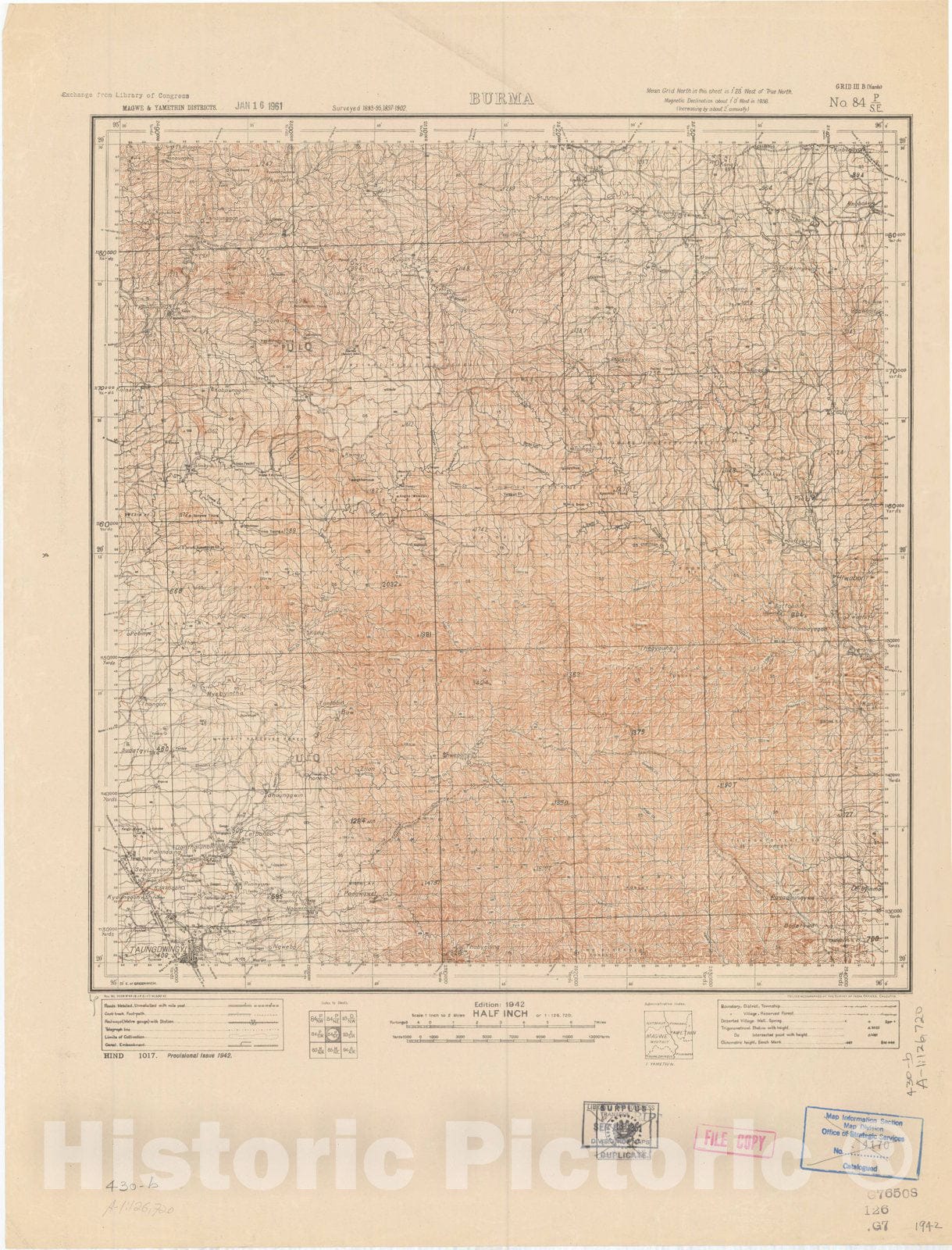 Map : Magwe & Yamethin Districts, Burma, No. 84 P/S.E. 1942, India and adjacent countries, Antique Vintage Reproduction