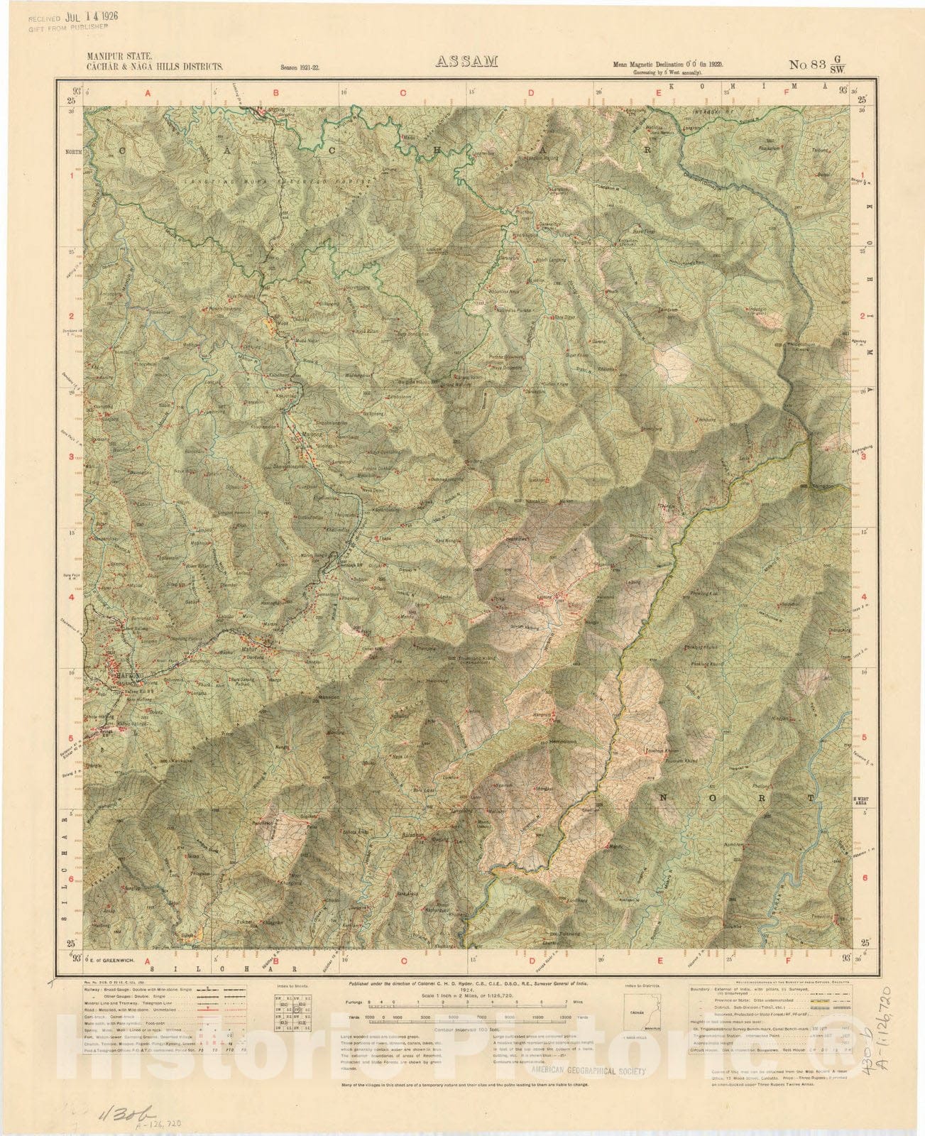 Map : Manipur State, Cachar & Naga Hills Districts, Assam, No. 83 G/S.W. 1924, India and adjacent countries, Antique Vintage Reproduction