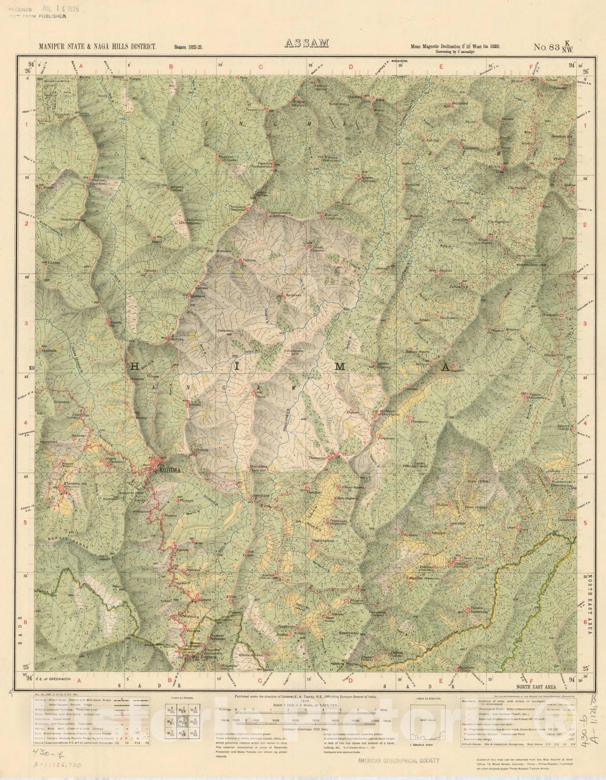Map : Manipur State & Naga Hills District, Assam, No. 83 K/N.W. 1924, India and adjacent countries, Antique Vintage Reproduction