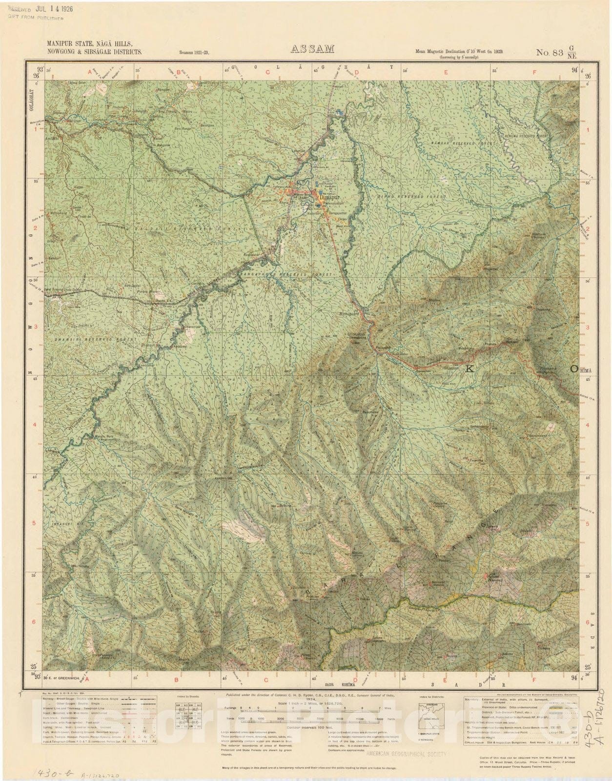 Map : Manipur State, Naga Hills, Nowgong & Sibsagar Districts, Assam, No. 83 G/N.E. 1924, India and adjacent countries, Antique Vintage Reproduction