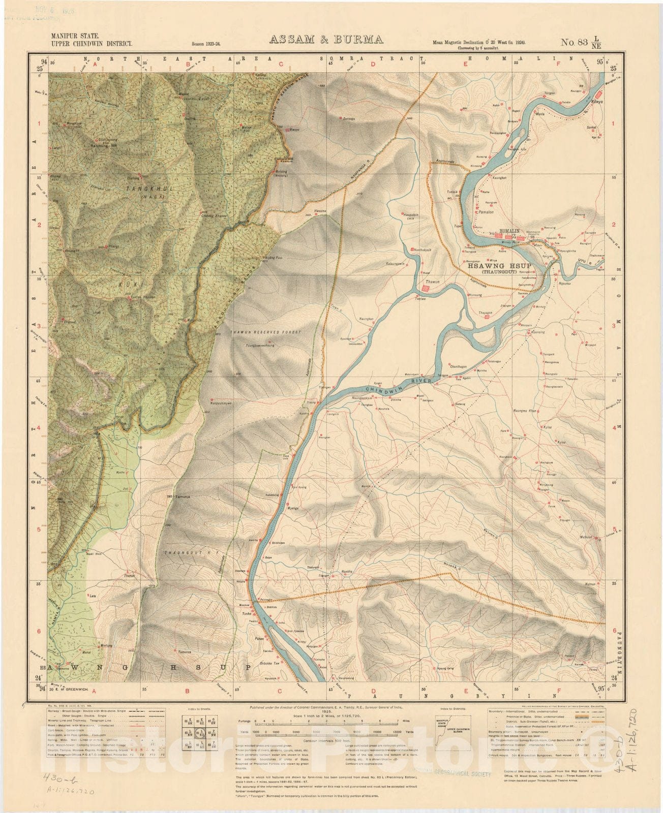 Map : Manipur State, Upper Chindwin District, Assam & Burma, No. 83 L/N.E. 1925, India and adjacent countries, Antique Vintage Reproduction