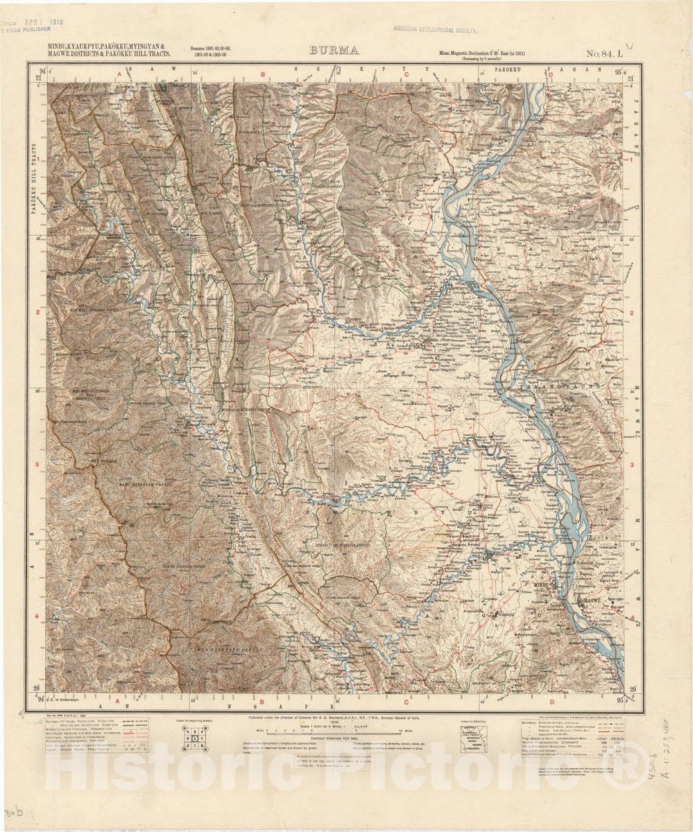 • Map : Minbu, Kyaukpyu, Pakokku, Myingyan & Magwe Districts & Pakokku Hill Tracts, Burma, No. 84 L 1916 2, India 1:253,440, Antique Vintage Reproduction