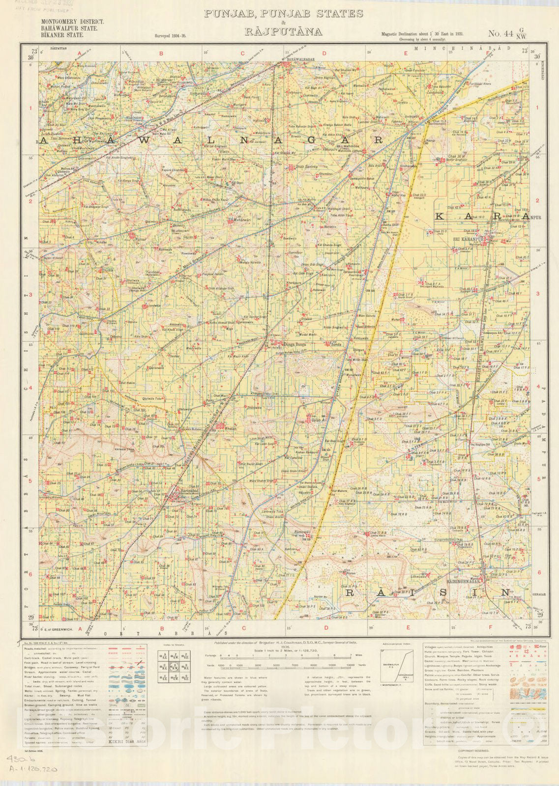 Map : Montgomery District, Bahawalpur State, Bikaner State, Punjab, Punjab States & Rajputana, No. 44 G/N.W. 1936, India 1:126,720, Antique Vintage Reproduction