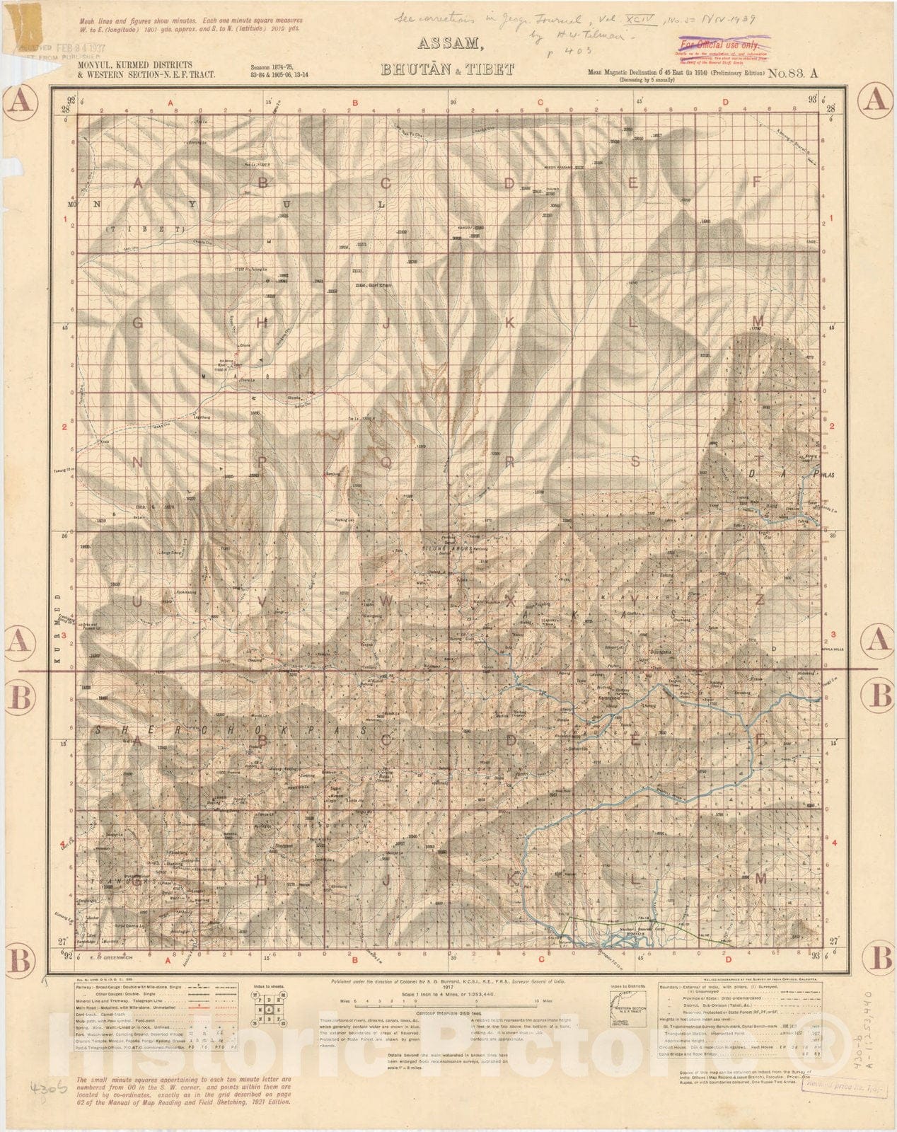 Map : Monyul, Kurmed Districts & Western Section N.E. F. Tract, Assam, Bhutan & Tibet, No. 83 A 1917, India 1:253,440, Antique Vintage Reproduction