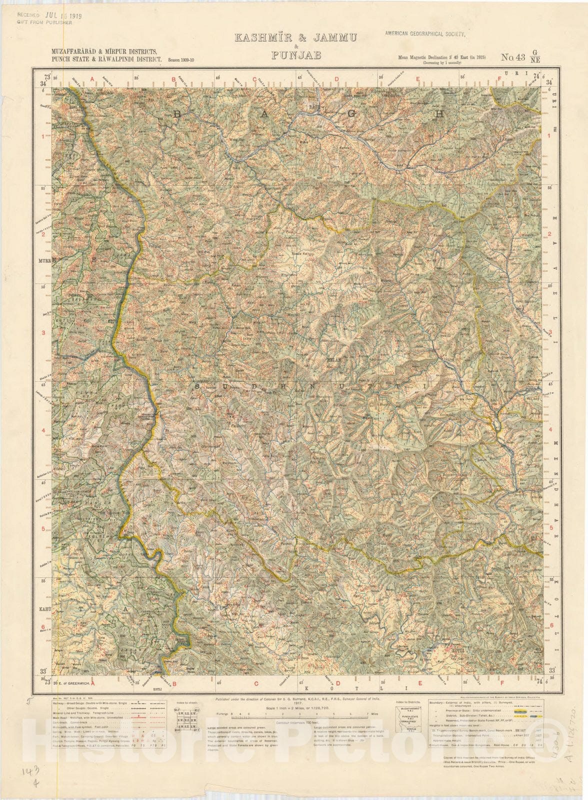 Map : Muzaffarabad & Mirpur Districts, Punch State & Rawalpindi District, Kashmir & Jammu & Punjab, No. 43 G/N.E. 1917, India and adjacent countries