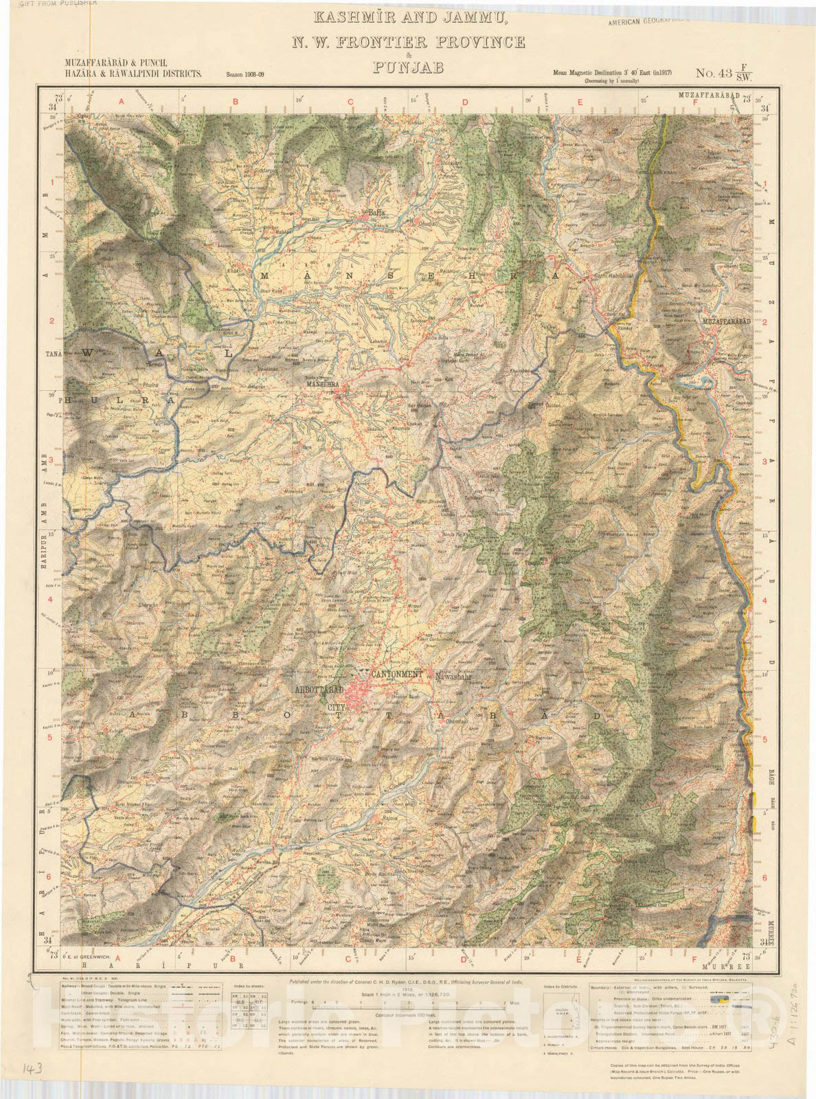 Map : Muzaffarabad & Punch, Hazara & Rawalpindi Districts, Kashmire and Jammu, N.W. Frontier Province & Punjab, No. 43 F/S.W. 1919, India and adjacent countries