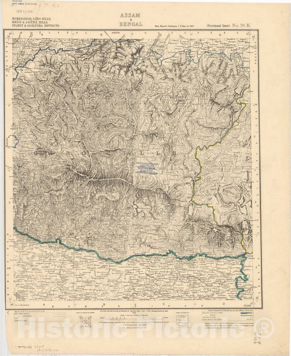 Map : Mymensingh, Garo Hills, Khasi & Jaintia Hills, Sylhet & Goalpara Districts, Assam & Bengal, No. 78 K1914, India 1:253,440, Antique Vintage Reproduction