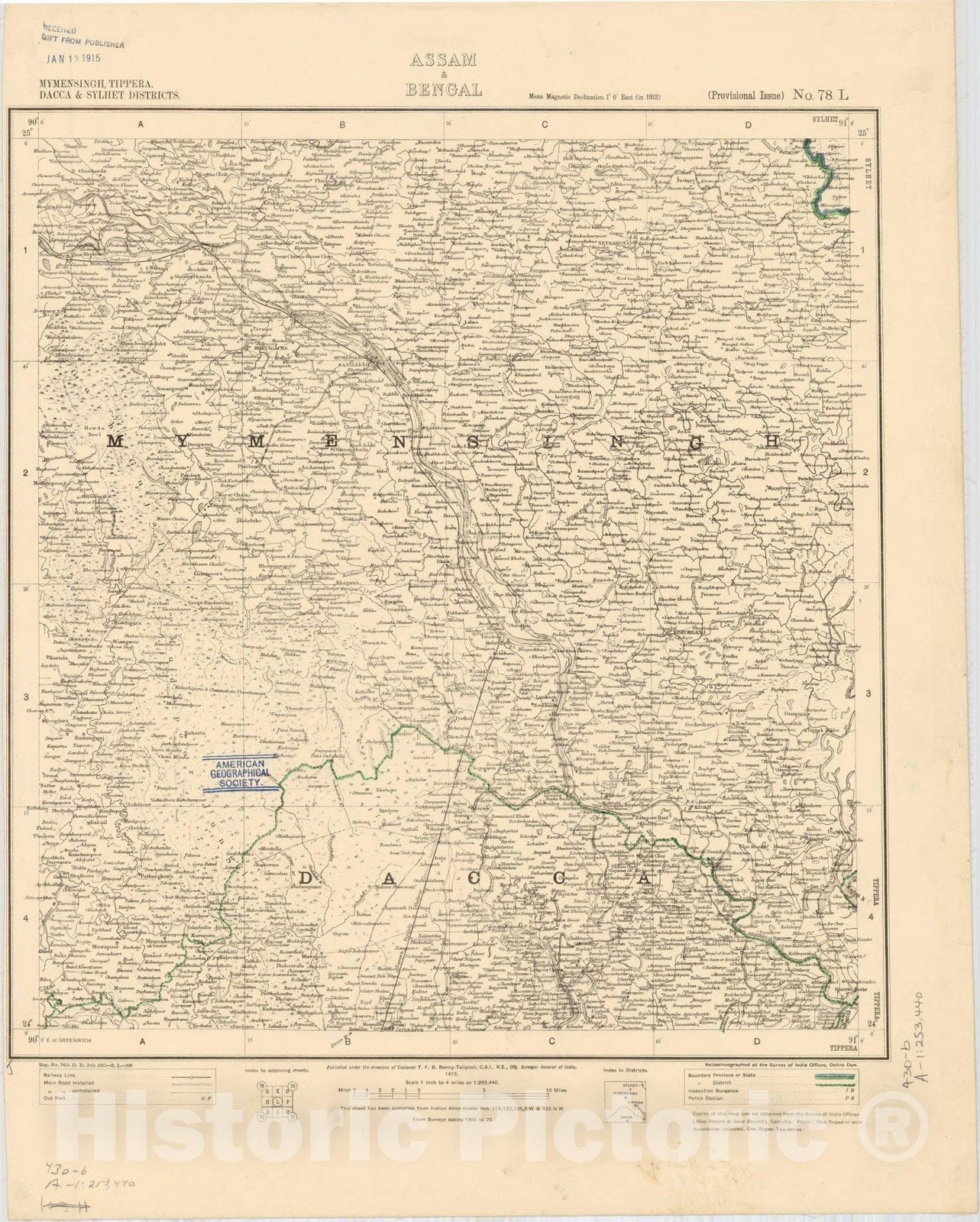 Map : Mymensingh, Tippera, Dacca & Sylhet Districts, Assam & Bengal, No. 78 L 1913, India 1:253,440, Antique Vintage Reproduction