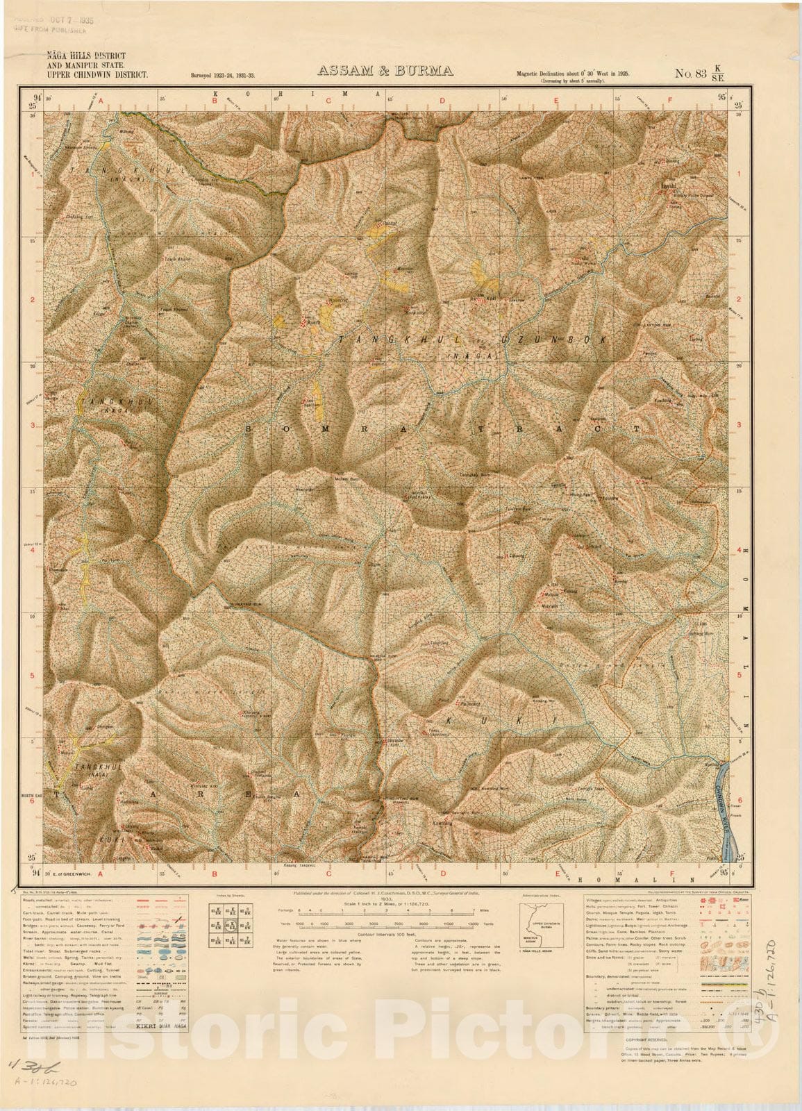 Map : Naga Hills District and Manipur State, Upper Chindwin District, Assam & Burma, No. 83 K/S.E. 1933 1, India and adjacent countries, Antique Vintage Reproduction