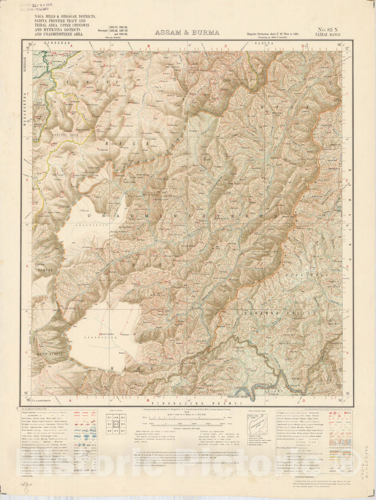 Map : Naga Hills & Sibsagar Districts, Sadiya Frontier Tract and Tribal area, Upper Chindwin, Assam & Burma, No. 83 N Patkai Range 1936, India 1:253,440