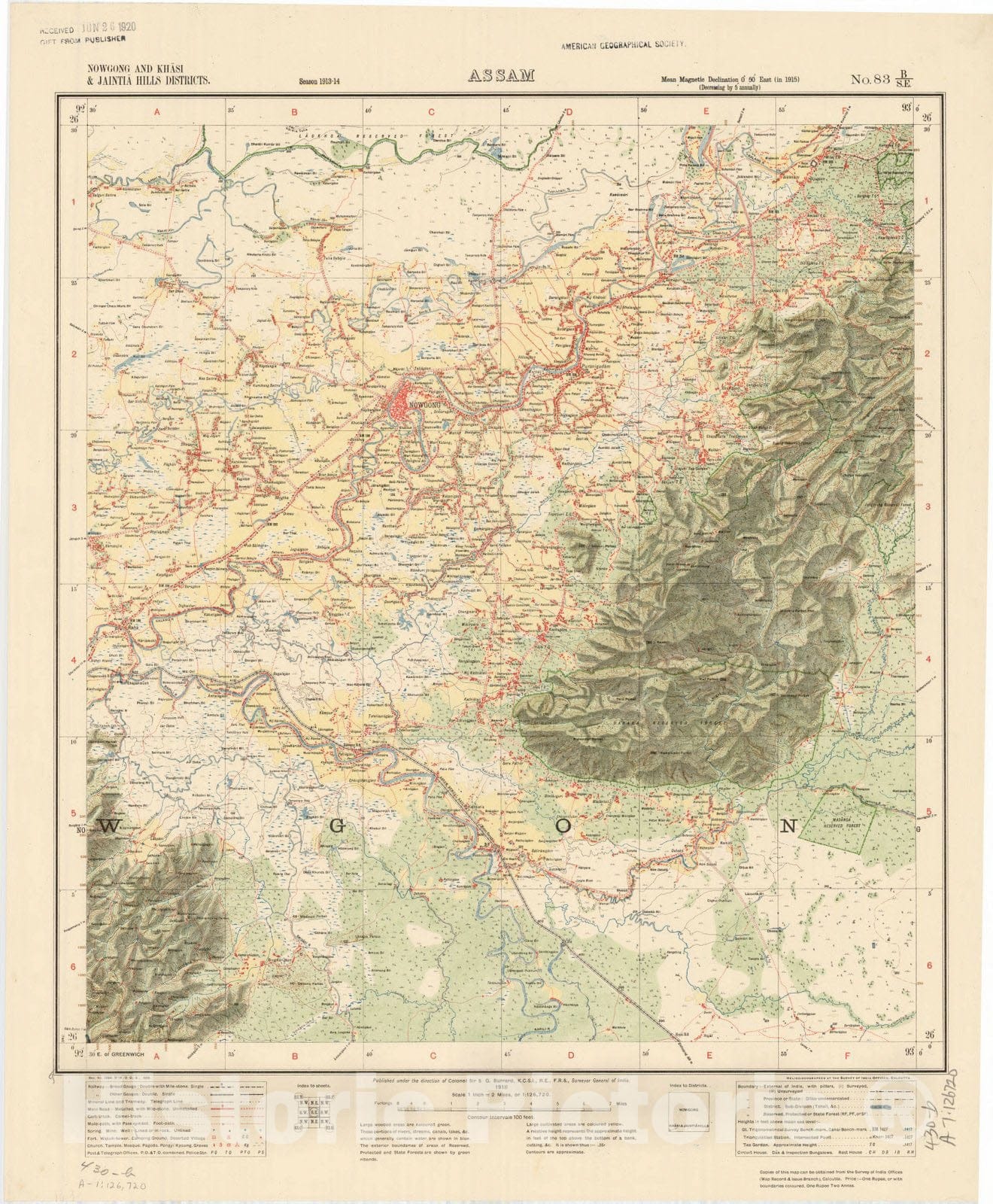 Map : Nowgong and Khasi & Jaintia Ills Districts, Assam, No. 83 B/S.E. 1918, India and adjacent countries, Antique Vintage Reproduction