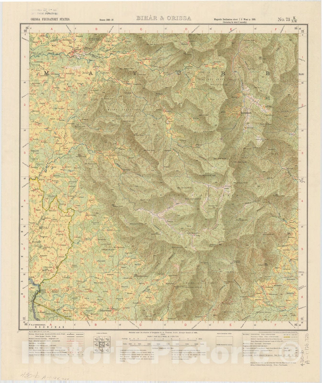 Map : Orissa Feudatory States, Bihar & Orissa, No. 73 K/N.W. 1930, India and adjacent countries, Antique Vintage Reproduction