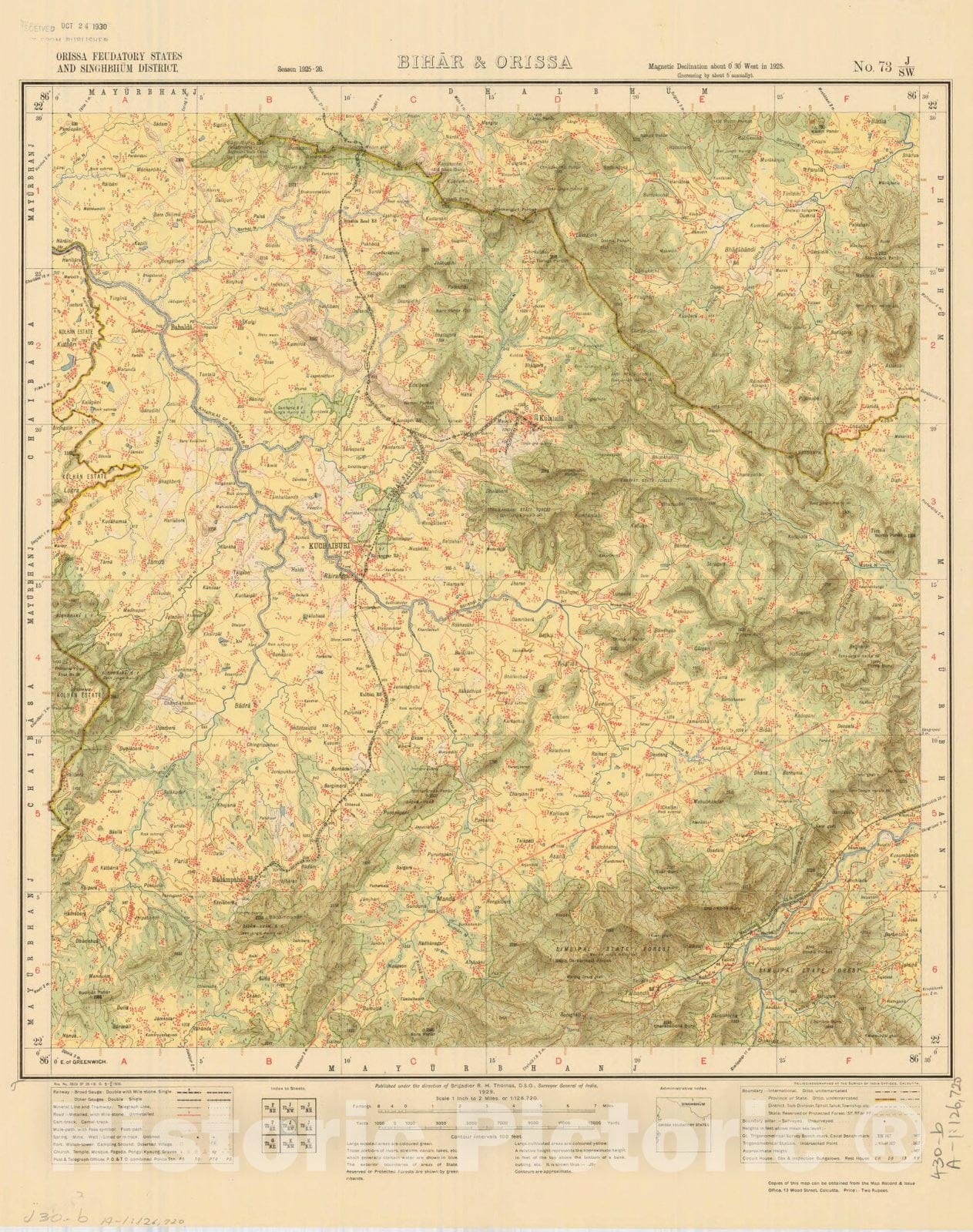 • .Map : Orissa Feudatory States and Singhbhum District, Bihar & Orissa, No. 73 J/S.W. 1929, India and adjacent countries, Antique Vintage Reproduction