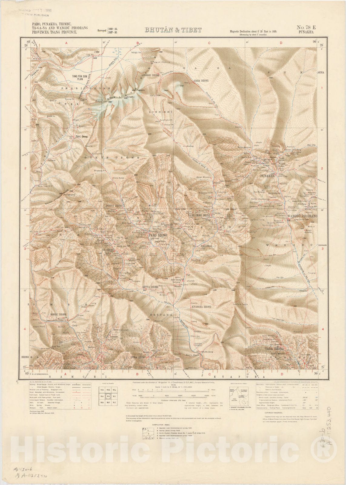 • .Map : Paro, Punakha, Thimbu, Ta-Ga-Na and Wangdu Phodrang Provinces, Tsang Province, Bhutan & Tibet, No. 78 E 1934, India 1:253,440, Antique Vintage Reproduction