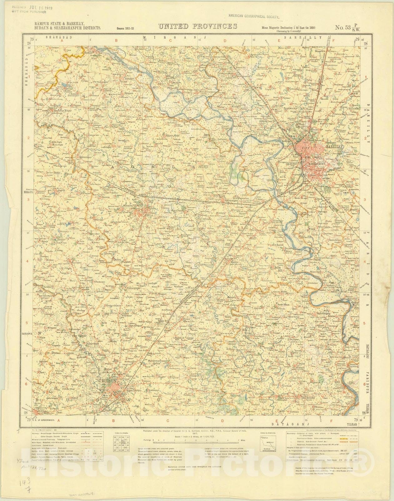 • .Map : Rampur State & Bareilly, Budaun & Shahjahanpur Districts, United Provinces, No. 53 P/S.W. 1917, India and adjacent countries, Antique Vintage Reproduction