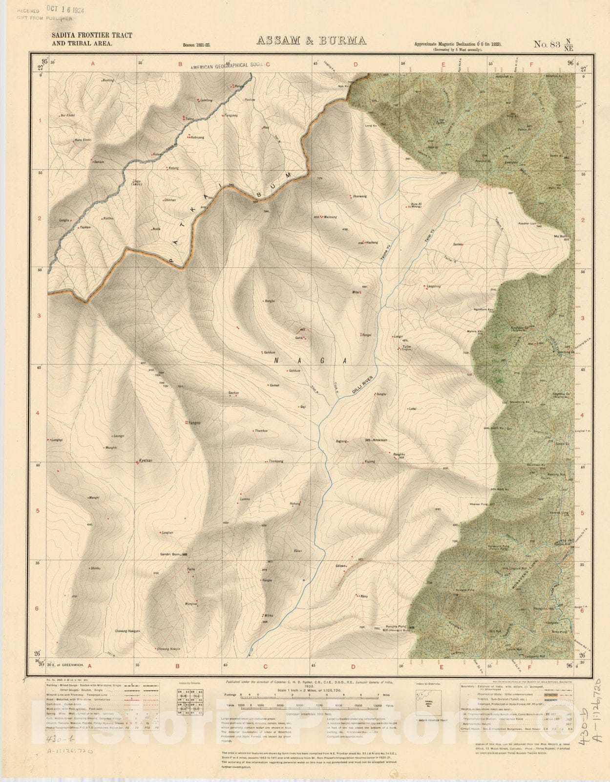 Map : Sadiya Frontier Tract and Tribal area, Assam & Burma, No. 83 N/N.E. 1923, India and adjacent countries, Antique Vintage Reproduction