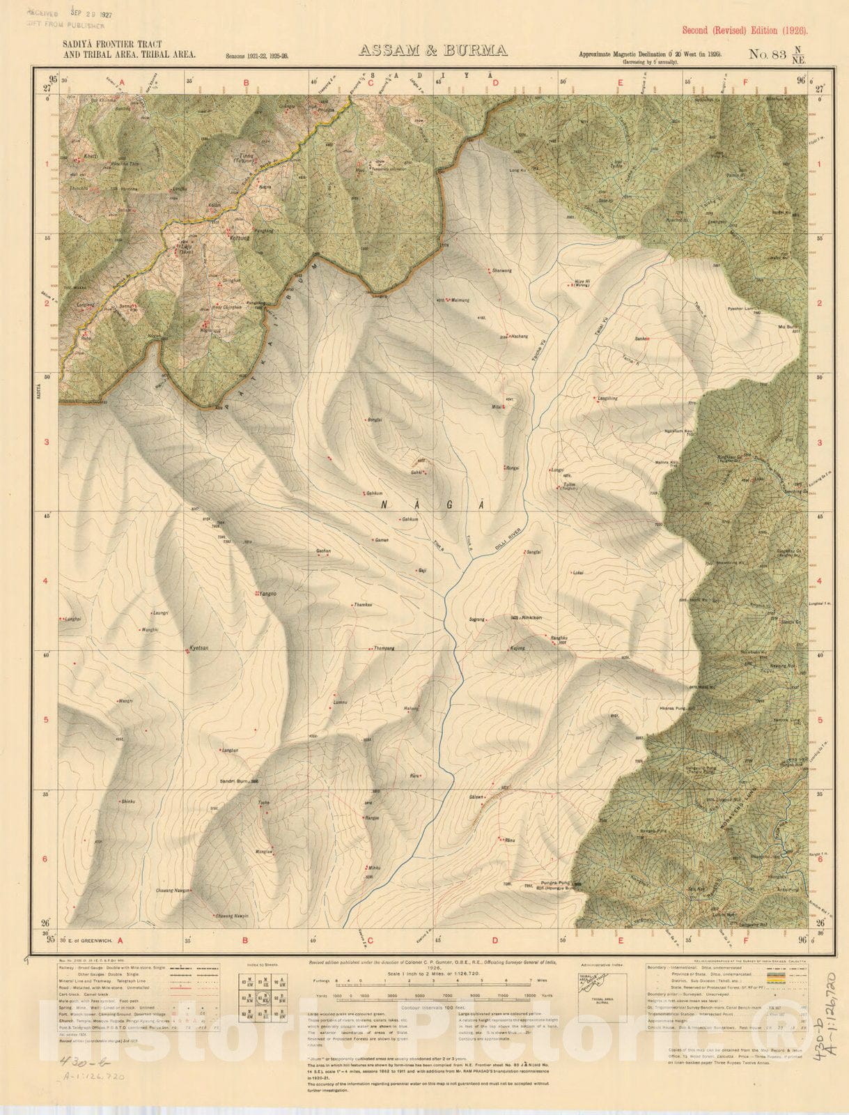 Map : Sadiya Frontier Tract and Tribal area, Tribal area, Assam & Burma, No. 83 N/N.E. 1926, India and adjacent countries, Antique Vintage Reproduction