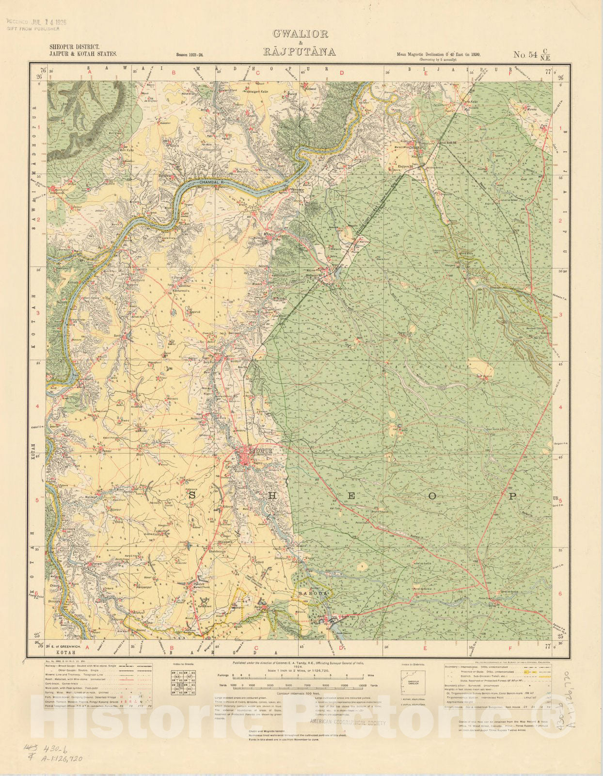Map : Sheopur District, Jaipur & Kotah States, Gwalior & Rajputana, No. 54 C/N.E. 1924, India and adjacent countries, Antique Vintage Reproduction