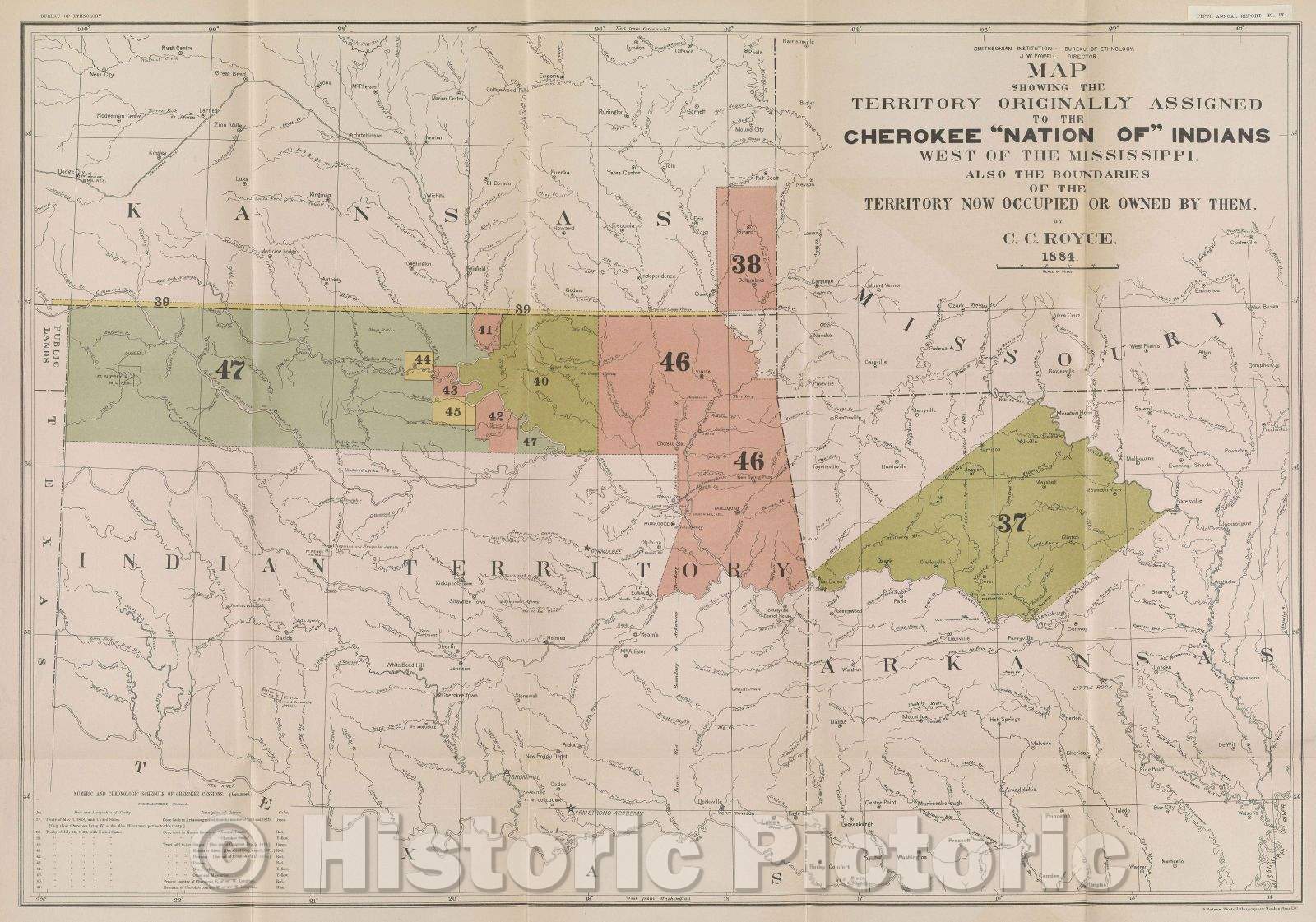 • .Historic Map : Map Showing the Territory Originally Assigned to the Cherokee "Nation of" Indians West of the Mississippi, also the boundaries of the Territory, 1884 , Vintage Wall Art