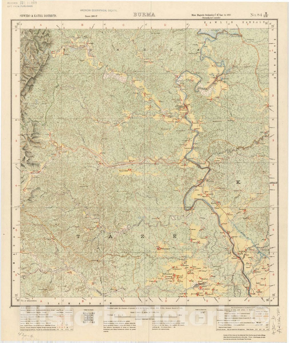 Map : Shwebo & Katha Districts, Burma, No. 84 M/S.W. 1917, India and adjacent countries, Antique Vintage Reproduction