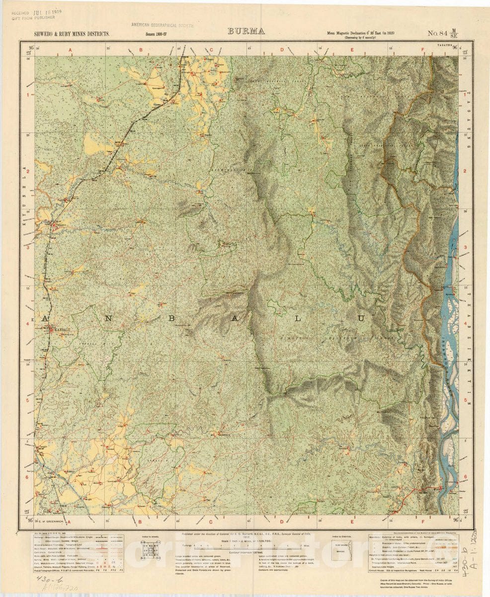 Map : Shwebo & Ruby Mines District, Burma, No. 84 M/S.E. 1917, India and adjacent countries, Antique Vintage Reproduction