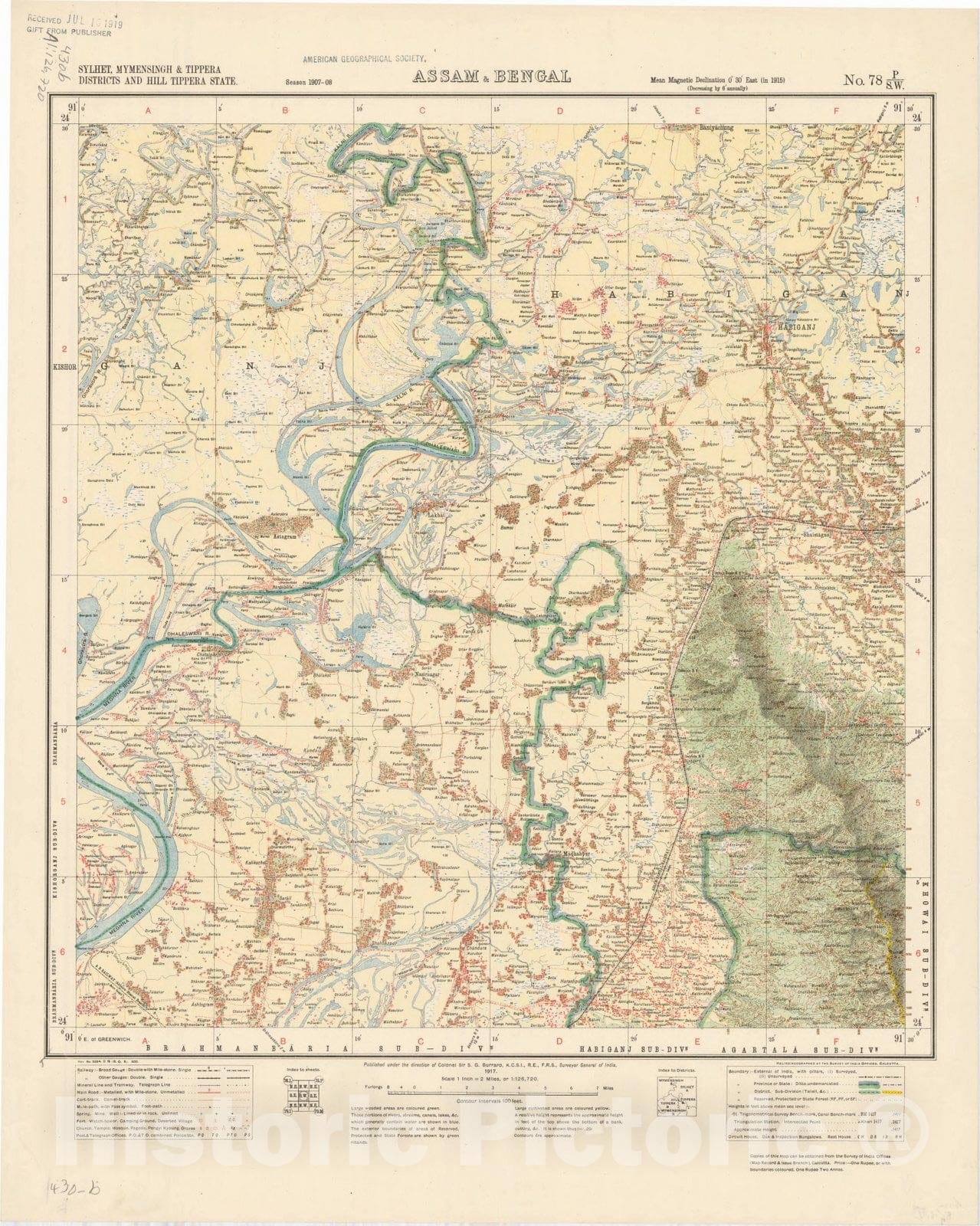 Map : Sylhet, Mymensingh & Tippera Districts and Hill Tippera State, Assam & Bengal, No. 78 P/S.W. 1917, India and adjacent countries, Antique Vintage Reproduction