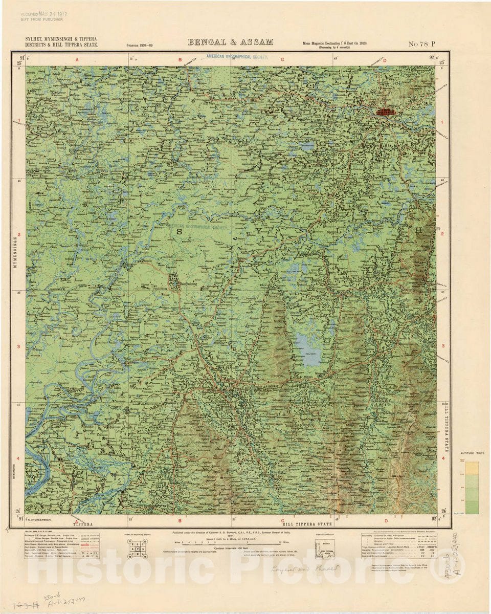 Map : Sylhet, Mymensingh &Tippera Districts & Hill Tippera State, Bengal & Assam, No. 78 P 1914 2, India 1:253,440, Antique Vintage Reproduction