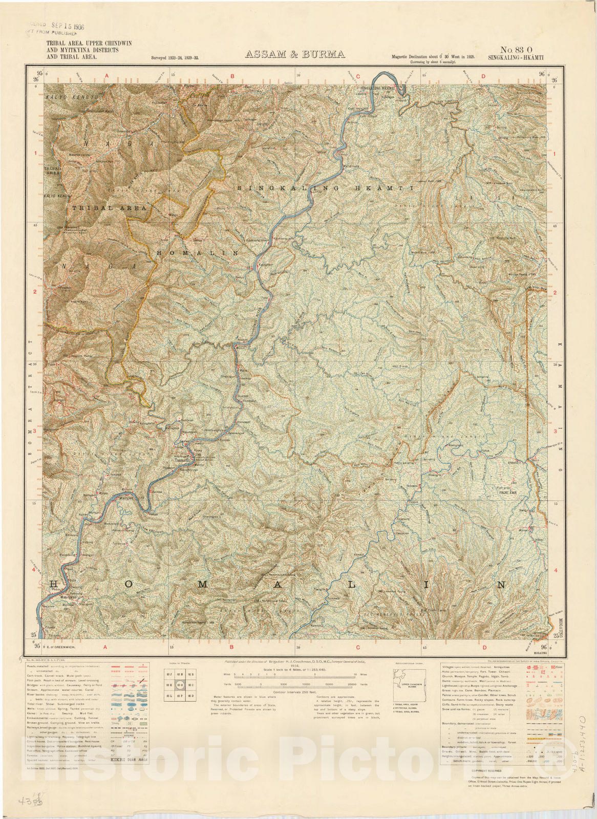 Map : Tribal area, Upper Chindwin and yitkyina Districts and Tribal area, Assam & Burma, No. 83 O Singkaling-Hkamti 1934, India 1:253,440, Antique Vintage Reproduction