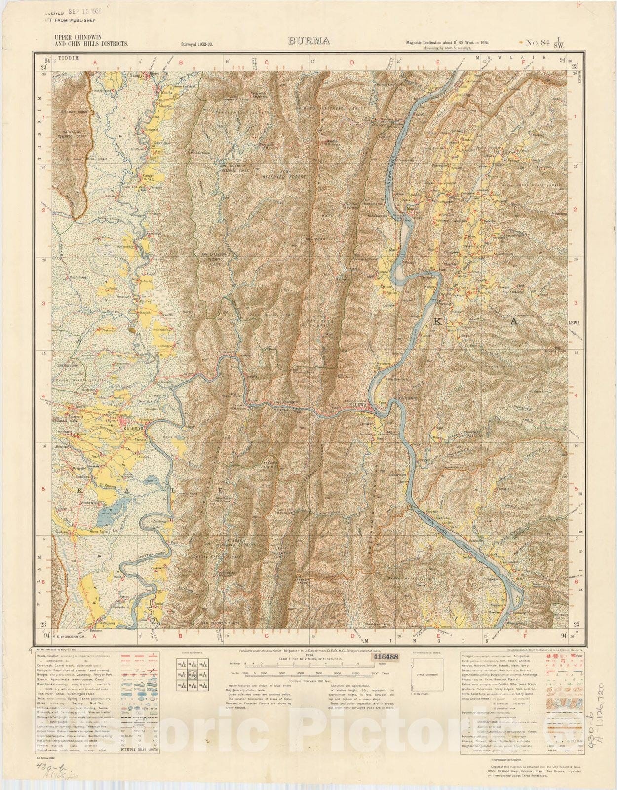 • .Map : Upper Chindwin and Chin Hills Districts, Burma, No. 84 I/S.W. 1934, India and adjacent countries, Antique Vintage Reproduction