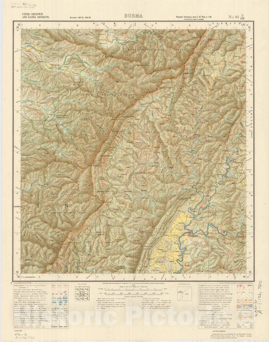 • Map : Upper Chindwin and Katha Districts, Burma, No. 83 P/S.W. 1934, India and adjacent countries, Antique Vintage Reproduction