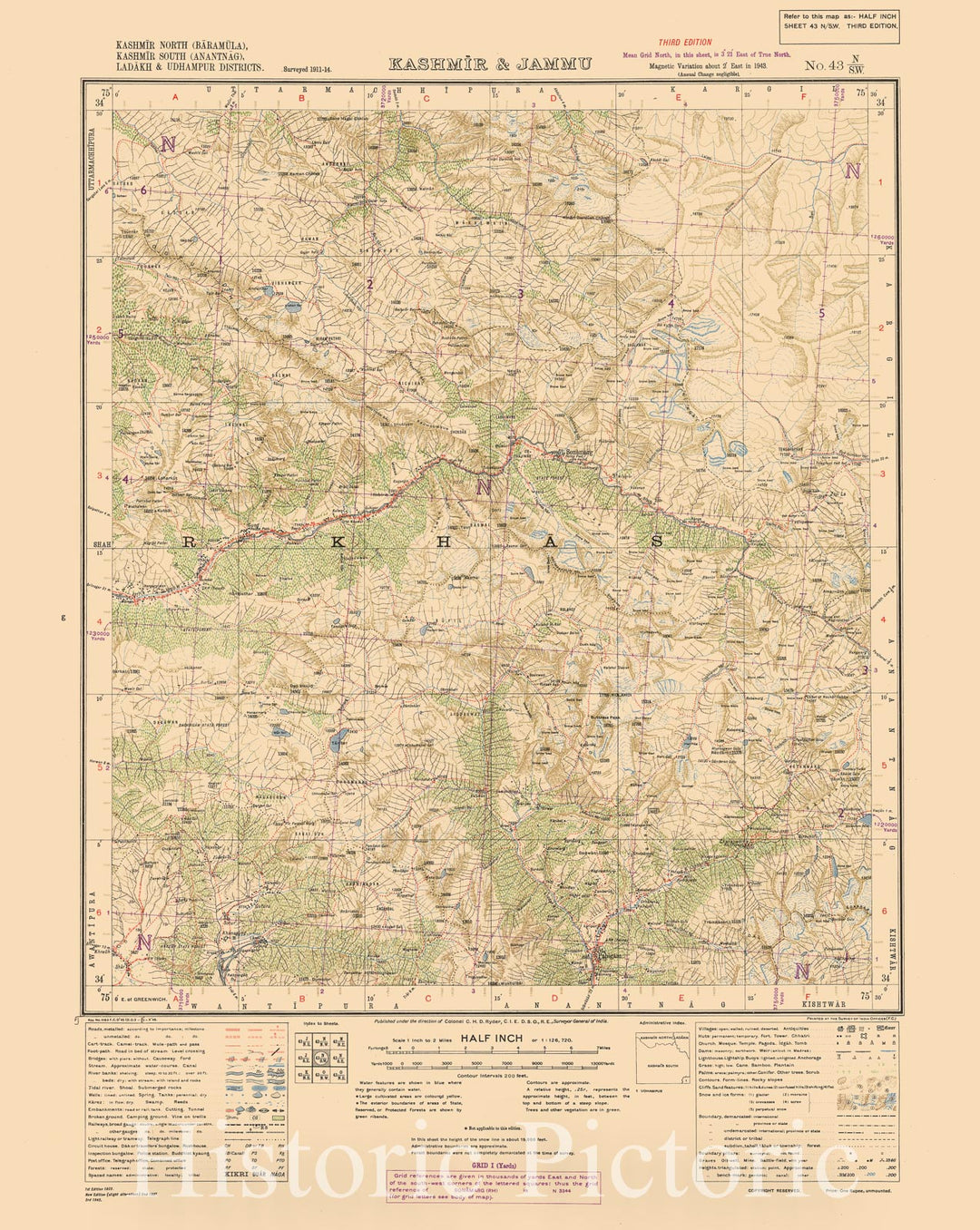 Map : Anantnag, Baramula, Ladakh & Udhampur Districts, Kashmir & Jammu, No. 43 N/S.W. 1922, India 1:126,720, Antique Vintage Reproduction