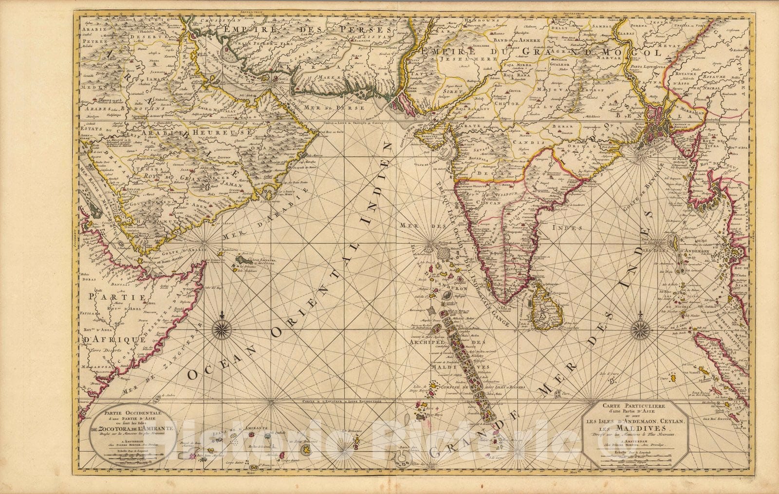 Carte Particuliere d'une Partie d'Asie ou sont les Isles d'Andemaon, Ceylan, les Maldives. | Atlas Nouveau Contenant Toutes Les Parties du Monde, ou Sont exactement Remarques Les Empires, Monarchies, Royaumes, Estats, Republiques & Peuples qui fy trouuent a present. Par le Sr. Sanson, Geographe ordinaire du Roy. Presente a Monseigeur le Dauphin ... Hubert Jaillot Geographe du Roy. A Paris, Chez Hubert Jaillot .... | This issue of the Mortier/Jaillot Atlas Nouveau has 169 maps (1 more than the normal count of 168) plus diagrams, text pages, decorated titles and index pages. It is noted for the large number of multi-sheet "Theatre de la Guerre" (Theater of War) maps covering the battles raging in Europe and the Americas during the Spanish War of Succession (1701-1713) and the Northern War (1700-1721). The Atlas Nouveaux was first published by Jaillot in Paris in 1681(46 maps) with later issues by him in 1684 (72 maps) and 1689 (80 maps). In 1692 Pierre Mortier published his first edition of the Jaillot atlas with 99 maps, another edition followed in 1696 with 111 maps. In 1707/1708 Mortier issued our edition with 168 maps. Later editions by Mortier expanded the atlas even further - 1708, 200 maps; ca 1721, 300 maps; ca 1735, 400 maps. The atlas maps are large folio size with most maps made of two sheets and many maps combining 4 or 6 sheets (those also issued as wall maps separately). The atlas is most impressive for its large size and number of maps as well as being up to date for its time. This copy colored in outline with relief shown pictorially.