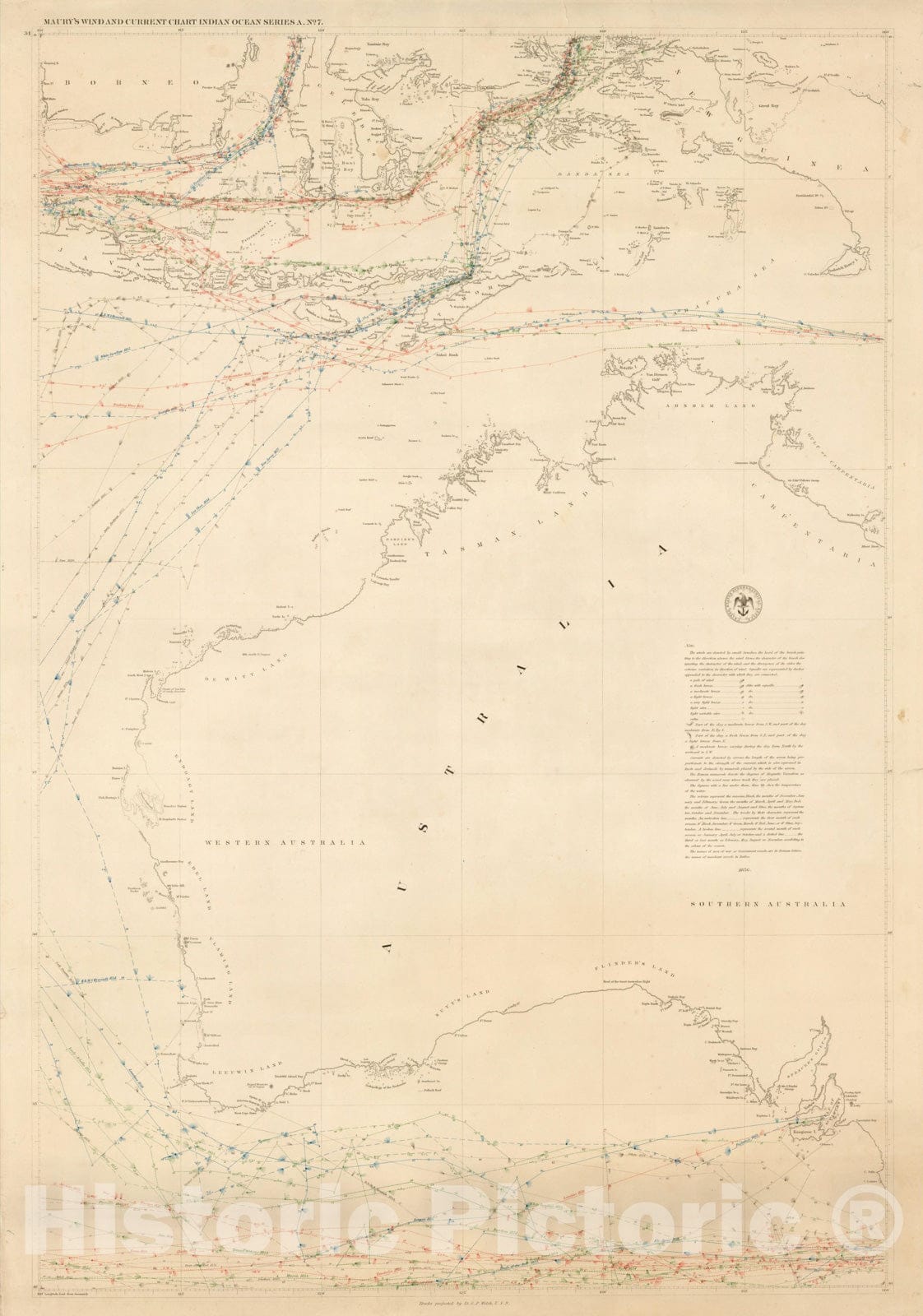 • .Historic Map : Maury's Wind and Current Chart, Indian Ocean Series A. No. 7 (Western Australia, New Guinea, Spice Islands, etc.), 1852, Matthew Fontaine Maury, Vintage Wall Art