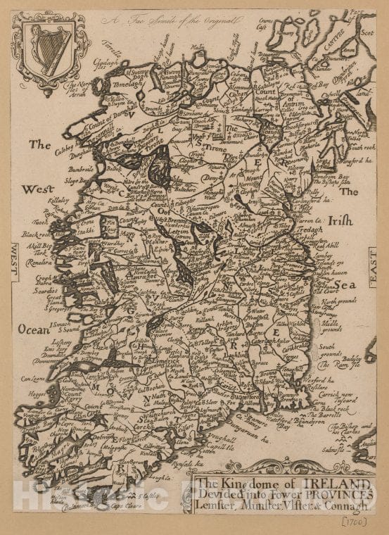 Historic 1700 Map - The Kingdome Of Ireland Devided Into Fower Provincesaof Europe - Ireland - Vintage Wall Art