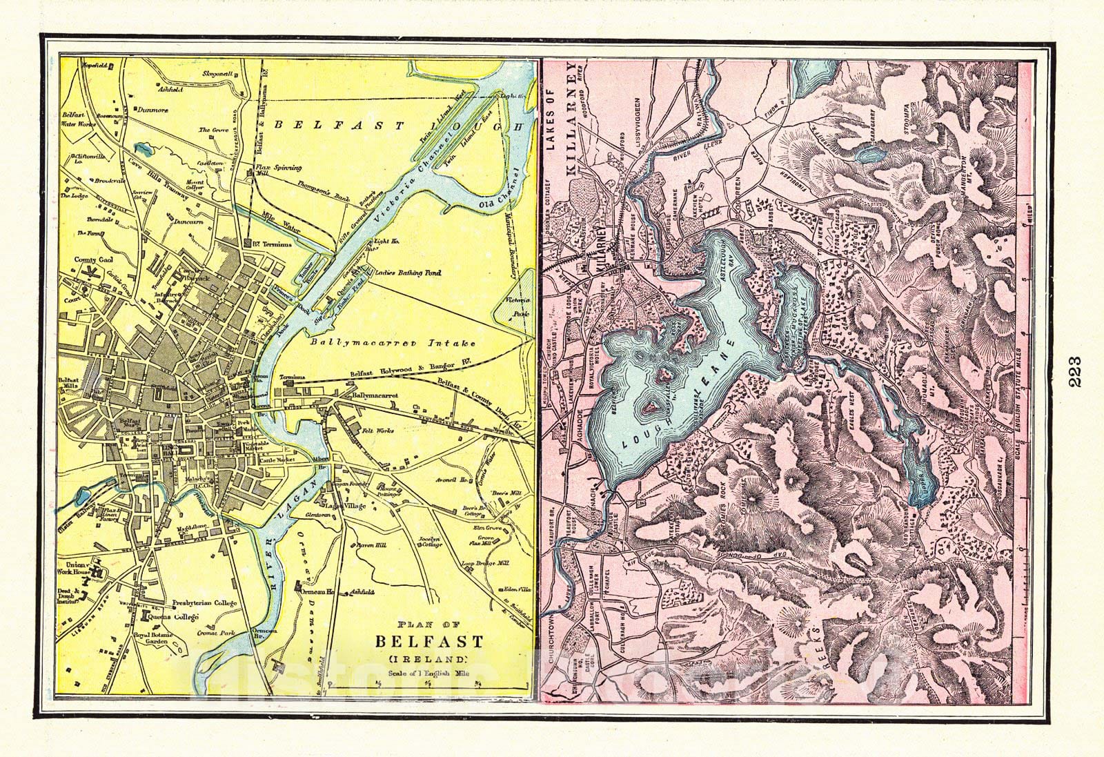 Vintage Map | 1898 Plan of Belfast (Ireland) & Lakes of Killarney | Cram, George F.