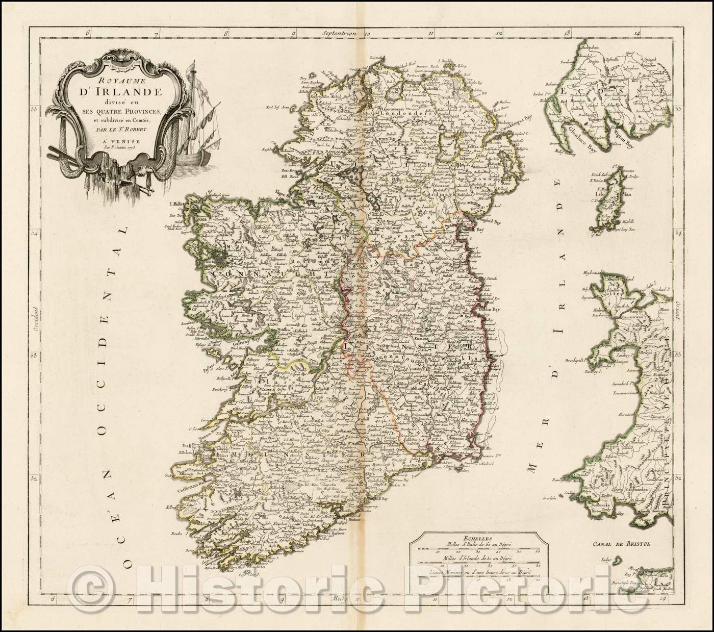 Historic Map - Carte De Royaume D'Irlande divise en ses Quatre Provinces et subdivise en Comtes/Map of Ireland, Extends east to show the Isle of Man, 1778 - Vintage Wall Art