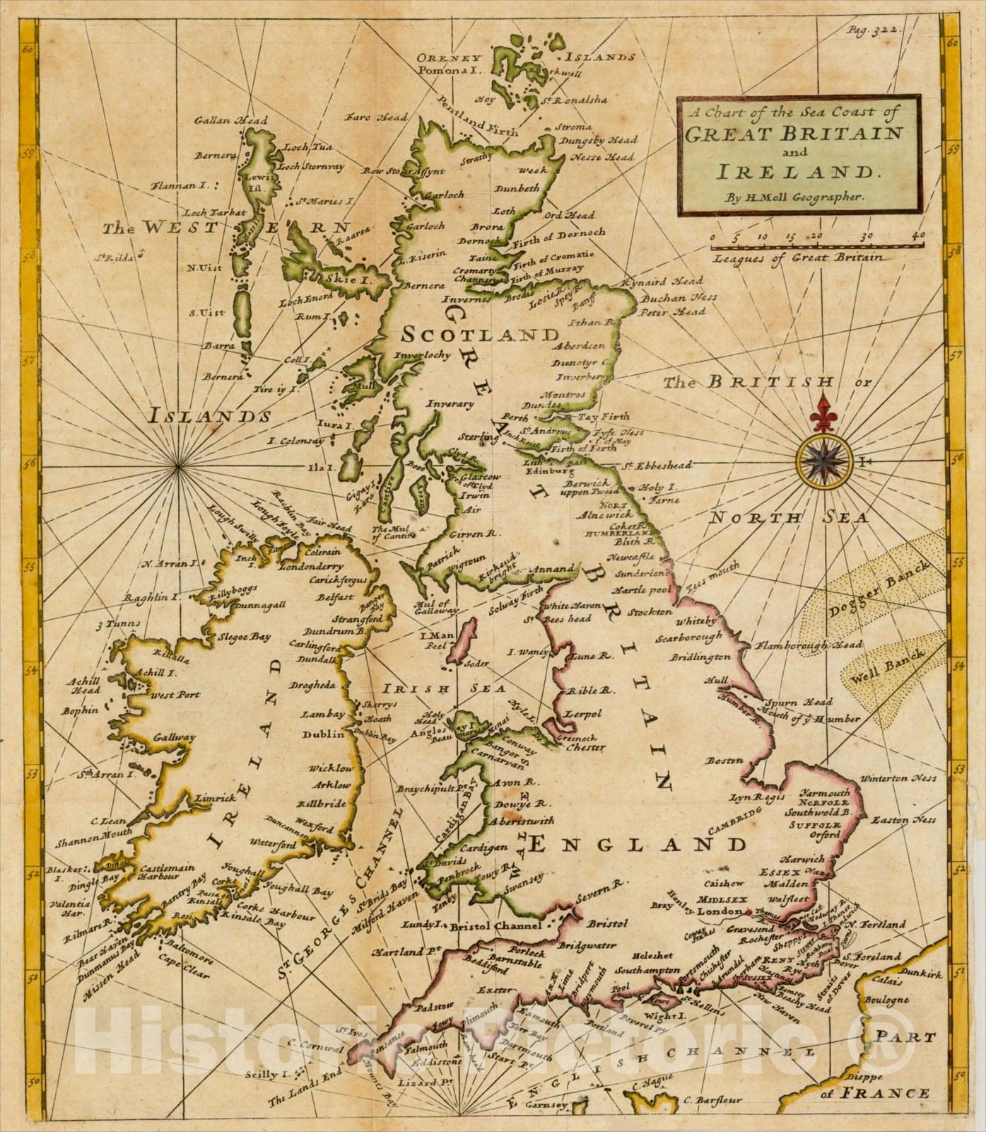 • .Historic Map : A Chart of the Sea Coast of Great Britain and Ireland, 1745, Herman Moll, Vintage Wall Art