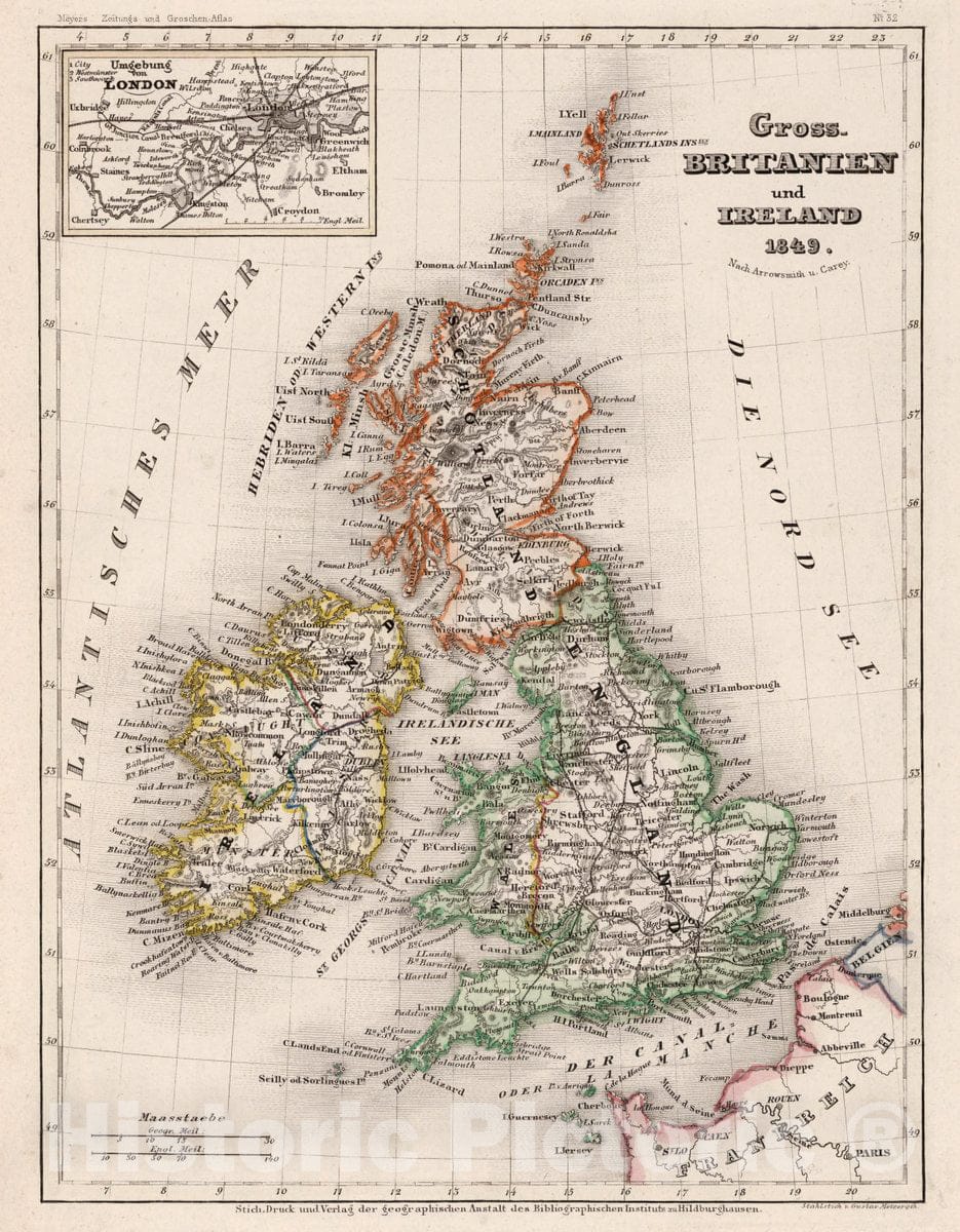 • .Historic Map : Great Britain, Gross. Britannien und Ireland, 1849 Atlas , Vintage Wall Art