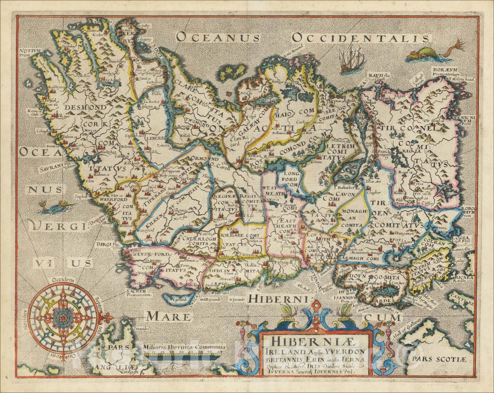 • .Historic Map : Hiberniae Ireland Anglis Yverdon Britannis Erin incolis Ierna , c1607, William Hole, Vintage Wall Art