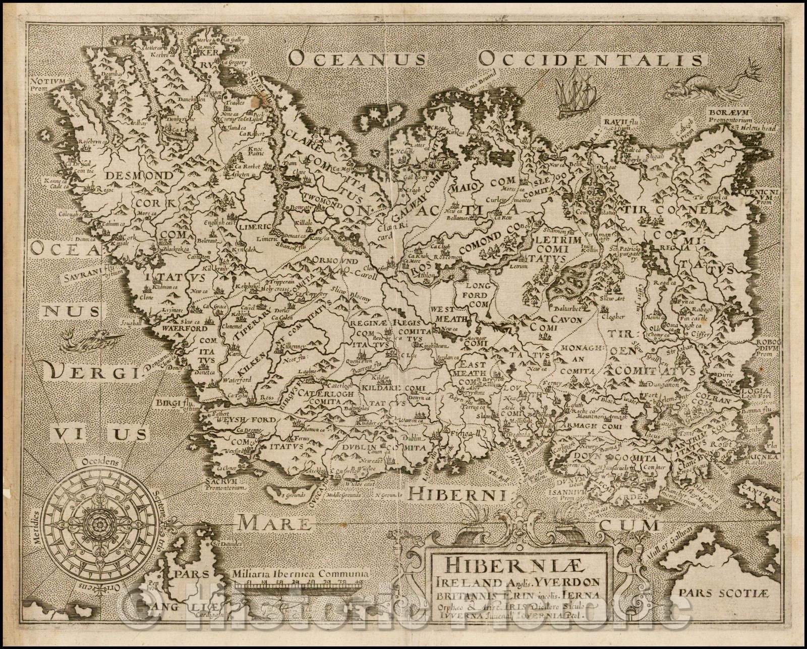 Historic Map - Hiberniae Ireland Anglis Yverdon Britannis Erin incolis Ierna, 1607, William Hole v2