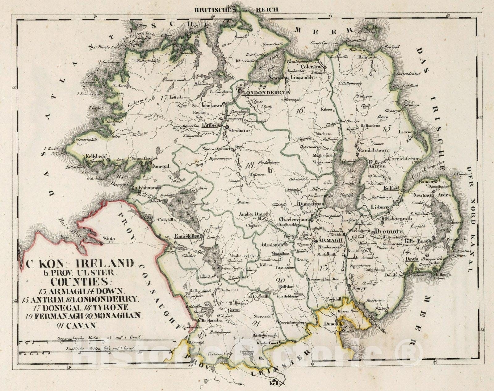 Historic Map : Ireland, V.3:11-15:XV. Britisches Reich. C. Kon: Ireland. b. Prov: Ulster. Counties: 13-21 1830 , Vintage Wall Art