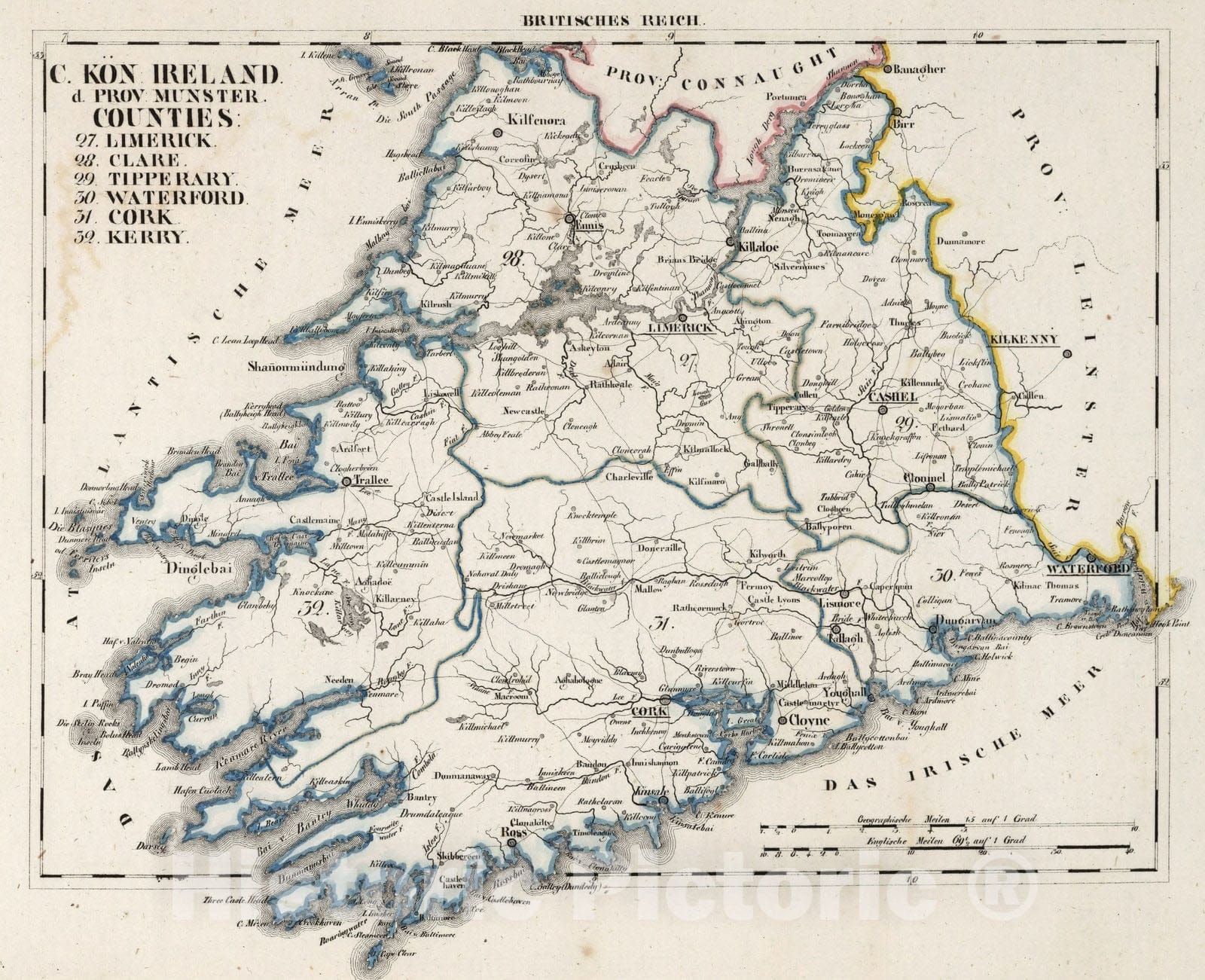 Historic Map : Ireland, V.3:11-15:XV. Britisches Reich. C. Kon: Ireland. d. Prov: Munster. Counties: 27-32 1830 , Vintage Wall Art