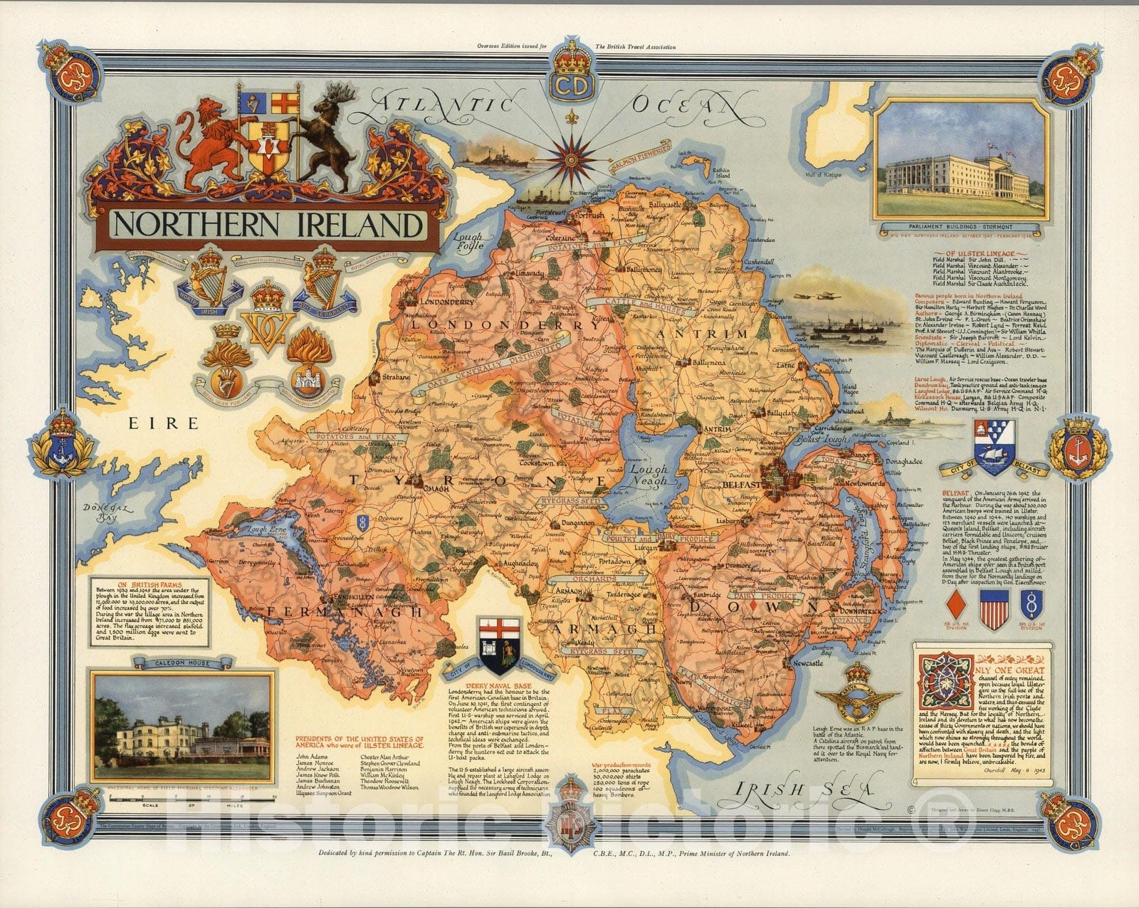 Historic Map : Northern Ireland. Designed and drawn by Ernest Clegg 1947 - Vintage Wall Art