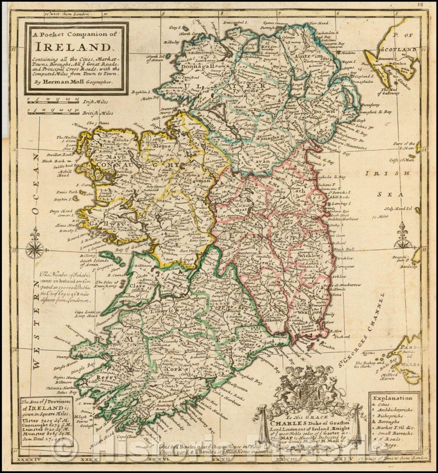 Historic Map - A Pocket Companion of Ireland. Containing all the Cities, Market-Towns, Boroughs, All ye Great Roads, and Principal Cross Roads, 1729 - Vintage Wall Art
