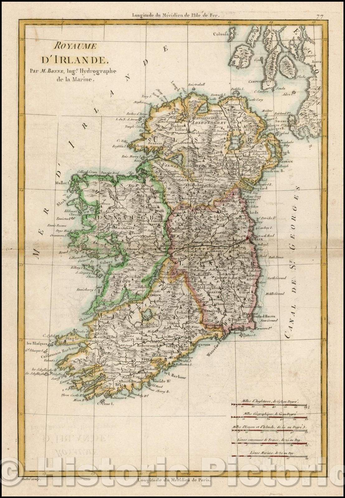 Historic Map - Royaume D'Irlande/Kingdom Of Ireland, 1787, Rigobert Bonne - Vintage Wall Art