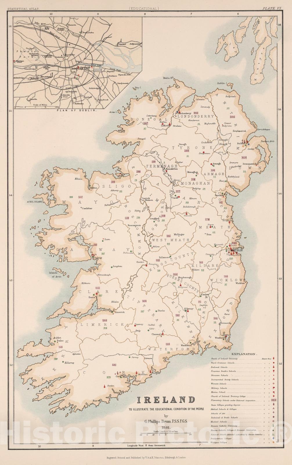 Historic Map : Statistical Atlas - 1881 Ireland to Illustrate the Educational Condition. - Vintage Wall Art