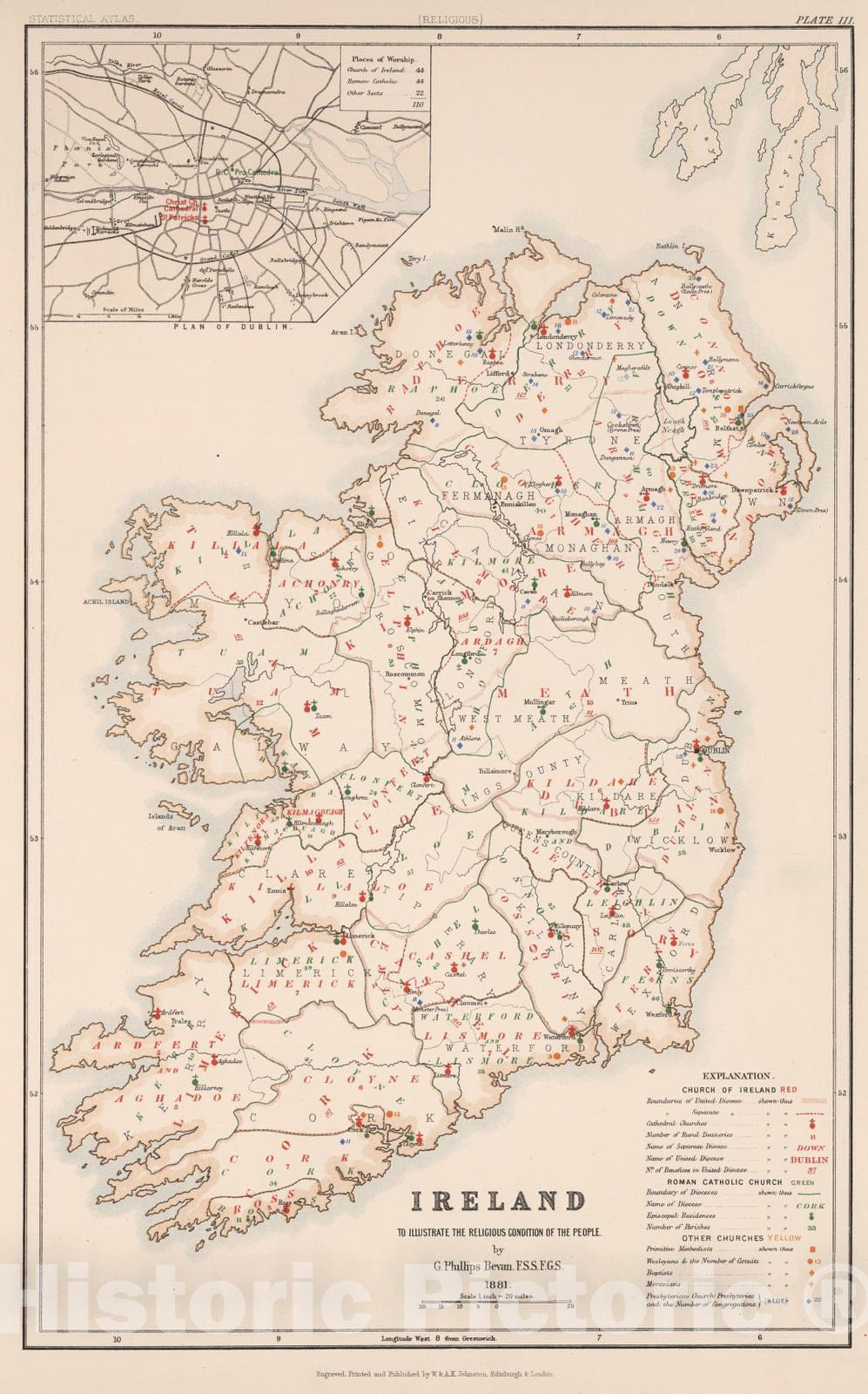 Historic Map : Statistical Atlas - 1881 Ireland to Illustrate the Religious Condition of the People. - Vintage Wall Art
