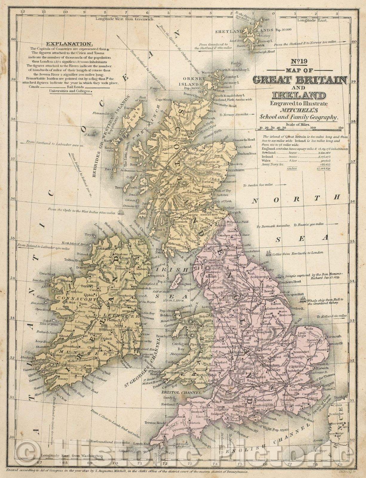 • .Historic Map : Map of Great Britain and Ireland engraved to illustrate Mitchell's School and Family Geography, 1840 , Vintage Wall Art